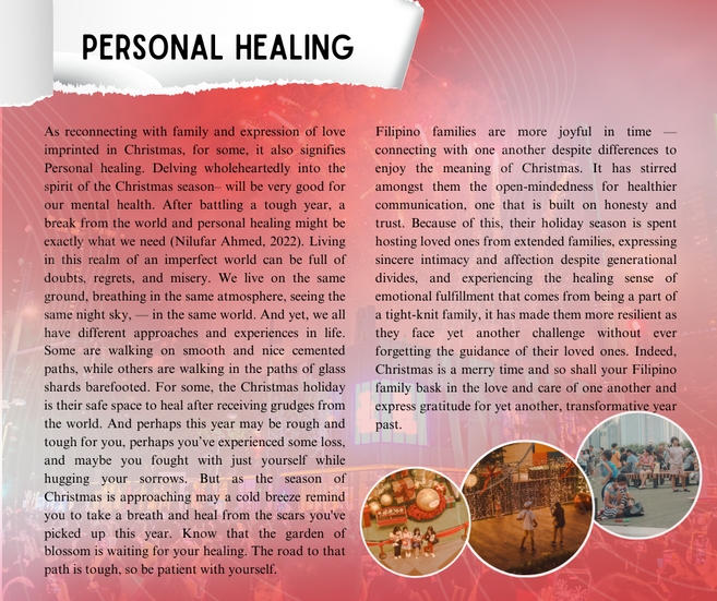As reconnecting with family and expression of love imprinted in Christmas, for some, it also signifies Personal healing. Delving wholeheartedly into the spirit of the Christmas season– will be very good for our mental health. After battling a tough year, a break from the world and personal healing might be exactly what we need (Nilufar Ahmed, 2022). Living in this realm of an imperfect world can be full of doubts, regrets, and misery. We live on the same ground, breathing in the same atmosphere, seeing the same night sky, — in the same world. And yet, we all have different approaches and experiences in life. Some are walking on smooth and nice cemented paths, while others are walking in the paths of glass shards barefooted. For some, the Christmas holiday is their safe space to heal after receiving grudges from the world. And perhaps this year may be rough and tough for you, perhaps you’ve experienced some loss, and maybe you fought with just yourself while hugging your sorrows. But as the season of Christmas is approaching may a cold breeze remind you to take a breath and heal from the scars you've picked up this year. Know that the garden of blossom is waiting for your healing. The road to that path is tough, so be patient with yourself.